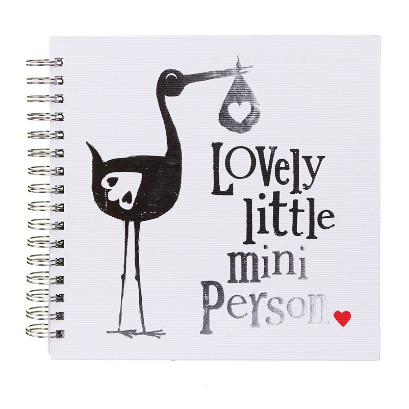 This baby book is ring-bound meaning it's easy to navigate throughout. The front cover features a metallic printed stork carrying a baby bundle and the words 'Lovely Little Mini Person!' A great baby shower, new baby or christening gift.