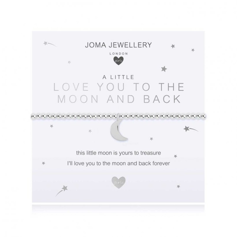 This wonderful children's Joma sentiment bracelet features a gorgeous moon charm. The bracelet is beautifully presented on a branded card with the title 'a little Love You to the Moon and Back' and the sentiment 'this little moon is yours to treasure, I'll love you to the moon and back forever'.