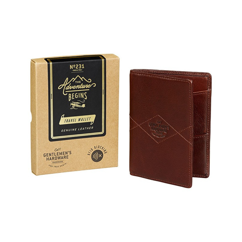Travel in sophisticated style with this leather travel wallet from Gentlemen's Hardware. Crafted from brown leather for durability and style, the hard-wearing design features space for your passport, travel documents and tickets and comes complete with a RFID lining that blocks radio frequency contactless payment. Embossed with the Gentlemen's Hardware branding and the inspiring phrase 'The Adventure Begins' inside, the folding wallet features four card slots and space for your travel essentials.