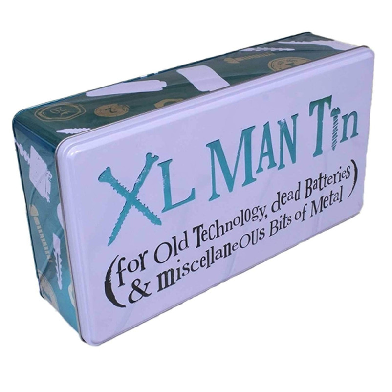This quality metal storage tin with features a hinged lid and is embossed with the words XL MAN TIN (old technology, dead batteries and miscellaneous bits of metal). The sides feature silhouette illustrations of the kinds of things that might be inside the tin, such as old batteries, leads, rawlplugs and mobile phones from a bygone era. This endlessly useful tin makes a great gift for husbands, boyfriends and handy men, perfect for a birthday, Christmas or Father’s Day gift.
